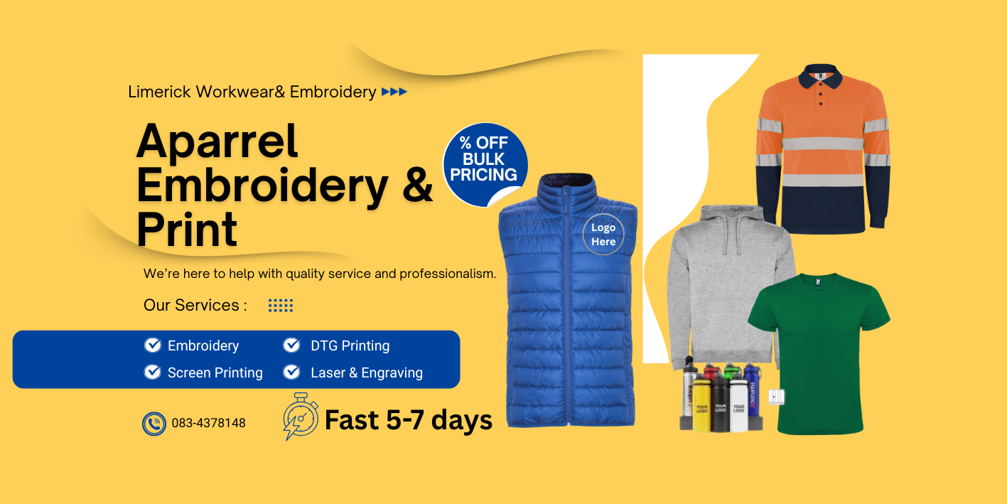 Whether you are looking to personalize apparel for an event, promote your brand, or create custom merchandise, our printing services ensure your designs are brought to life with precision and quality. Limerick Workwear Embroidery & Print